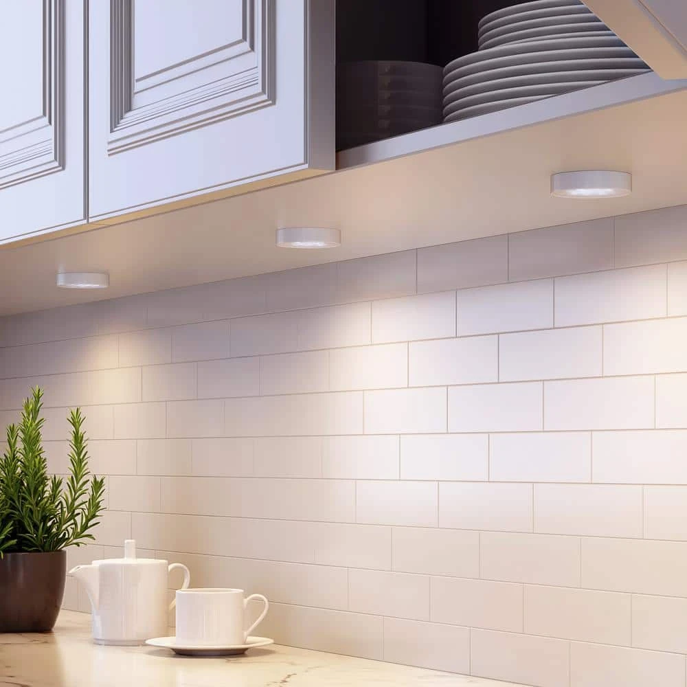 Commercial Electric LED RGB puck light, white, 3 pack. This LED puck light is RGB color changing light. It is a great and simple solution to light up your kitchen counter, shelves or work area. Each puck light can be easily installed with the included mounting hardware.