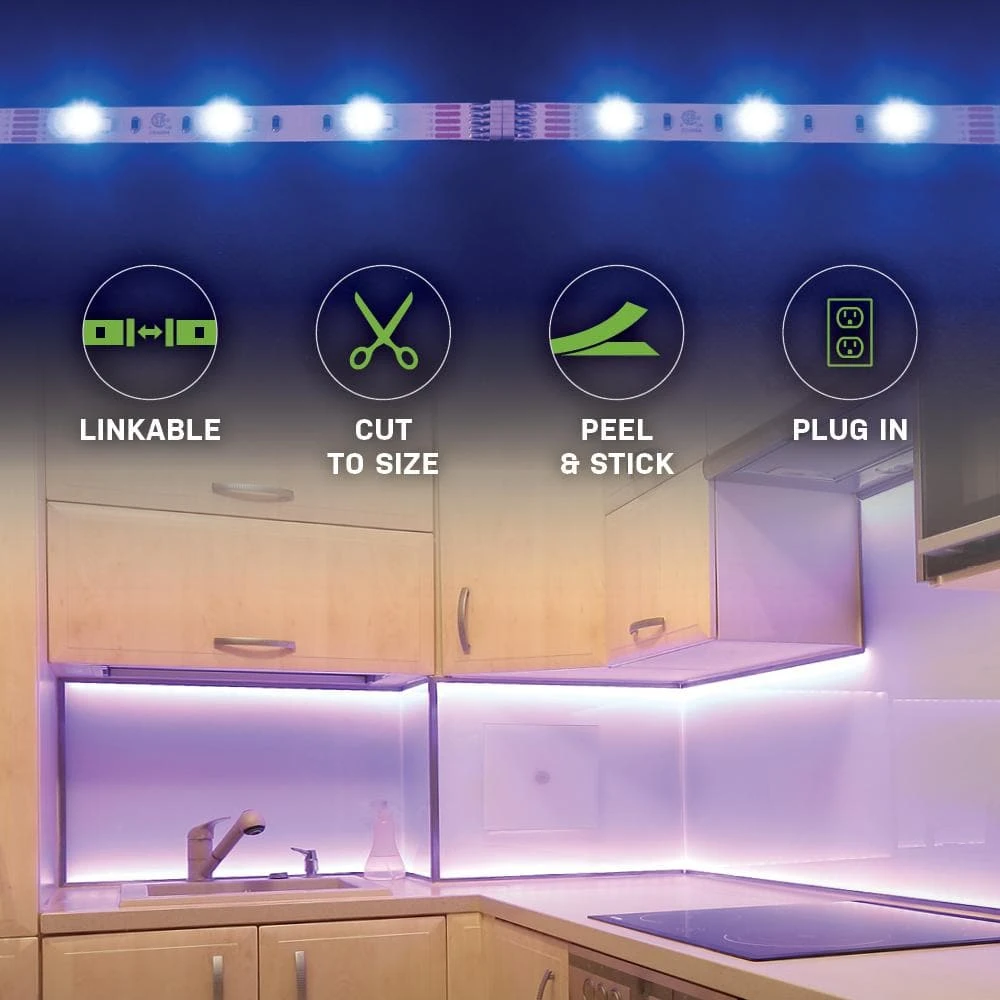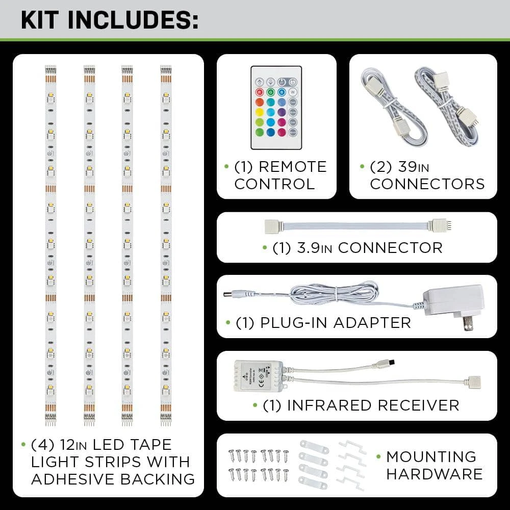 This Commercial Electric tape light kit includes 4 in. x 12 in. linkable indoor RGB color plus warm white LED tape lights, power supply, mounting hardware and connector wires. LED’s are extremely energy efficient, with the full 48 ft. using a mere 8.5-Watt. Use the strips to add accent lighting to any space. Great for kitchens, work spaces, showrooms and more. Customize application with available connector or accessory set.