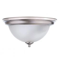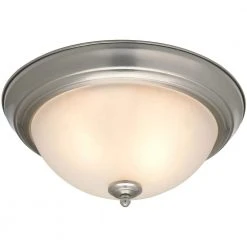 The Commercial Electric twin pack Flush Mount is a great look at a great value. From the professional to the do-it-yourselfer, the twin pack flushmount is an exceptional choice. Each Flush Mount is finished in Brushed Nickel with frosted white glass. Each Flush Mount uses two 60-Watt medium-base light bulbs. From kitchen to bath or any room in between, the CE Brushed Nickel twin pack will not only enhance but will save cost to your home as well.
