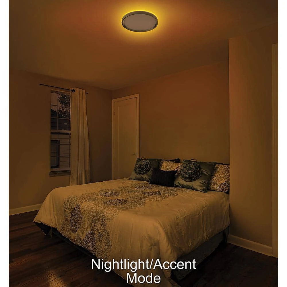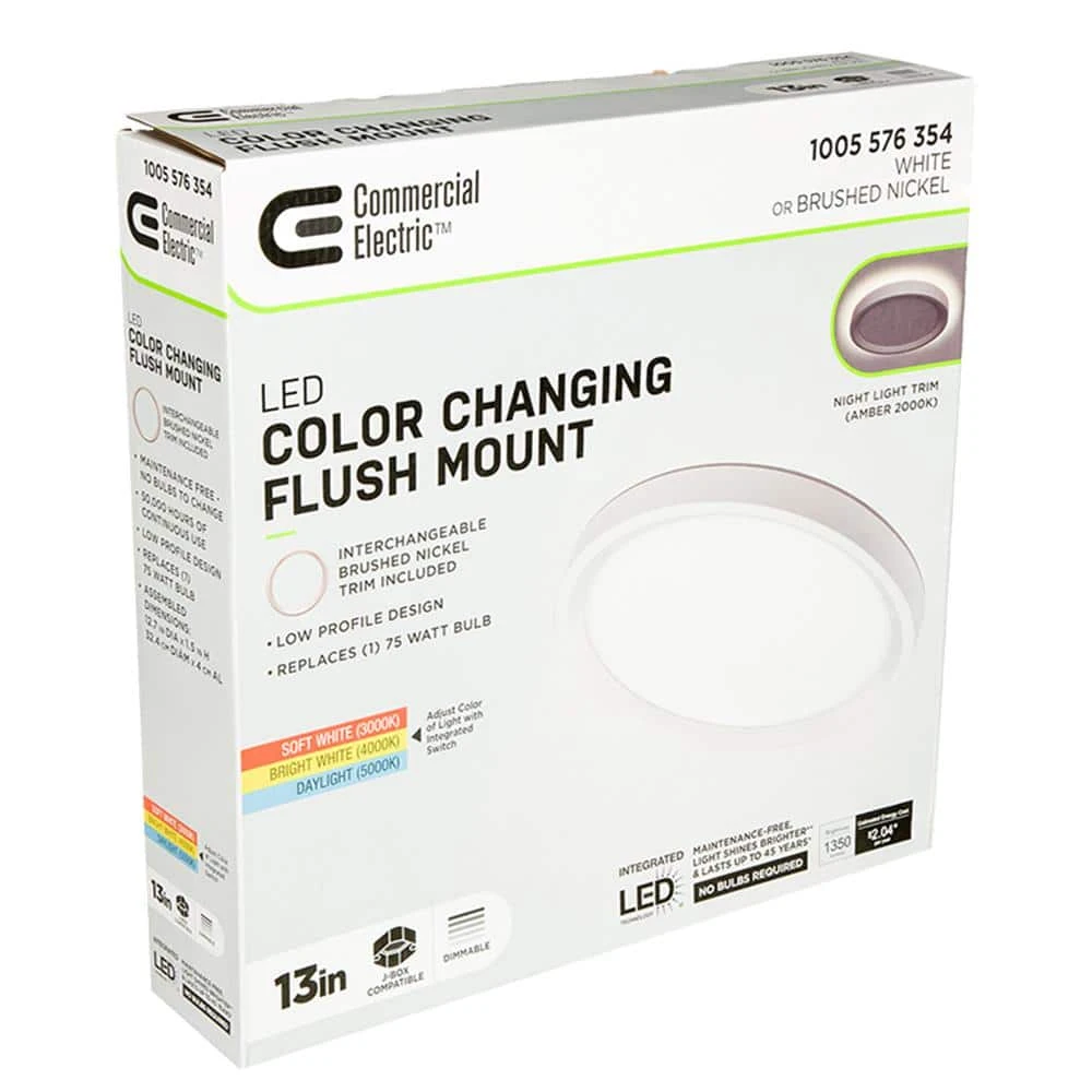 Commercial Electric Low Profile 13in. LED Flush Mount with 2 interchangeable trims is the perfect way to update your lighting by replacing outdated incandescent bulbs with energy-efficient LED technology. Prior to installation, switch out the White trim for the Brushed Nickel trim to add a little pop of color into your space. Additionally, choose between 3 color temperatures of light output: Soft White, Bright White or Daylight using the slide switch on the back of the fixture. Activate the Night Light feature which emits a Soft Amber glow around the fixture providing warm ambient lighting. Our innovative mounting system allows for quick installation into existing junction boxes using the TwistFit mounting bracket. (included) This flush mount is maintenance free with no bulbs required and lasts up to 50,000 hours. Great for kitchen, pantry, bedrooms, bathrooms, closets, stairways, hallways, basement, laundry room, craft room, playroom, den/office, retail store or boutique.