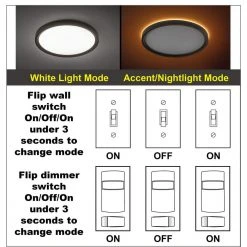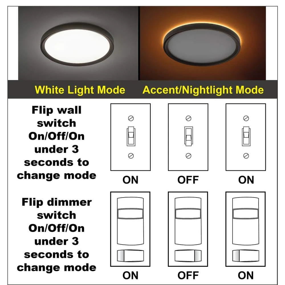 Commercial Electric’s Low Profile 13 in. LED Flush Mount ceiling light with 2 interchangeable trims is an innovative Modern fixture with the latest energy-efficient LED technology. Choose between White or Oil Rubbed Bronze trims to compliment your room’s decor and prior to installation, you choose color of light between Soft White, Bright White or Daylight using the slide switch on the back of the fixture. This fixture also has a unique Night Light feature which emits a soft Amber glow behind the fixture providing a warm ambiance for your space. You activate it by an extra toggle gesture from your wall switch, On/Off/On. It emits 1350 Lumens of brightness using only 17-Watt of electricity reducing energy consumption all year round. Installation is a breeze using the TwistFit mounting method, mounting plate to junction box, make wire connections, twist to secure in place. (details in instructional manual). Ideal applications are kitchen, pantry, bedrooms, bathrooms, closets, stairways, hallways, basement, laundry room, craft room, playroom, den/office, retail store or boutique.