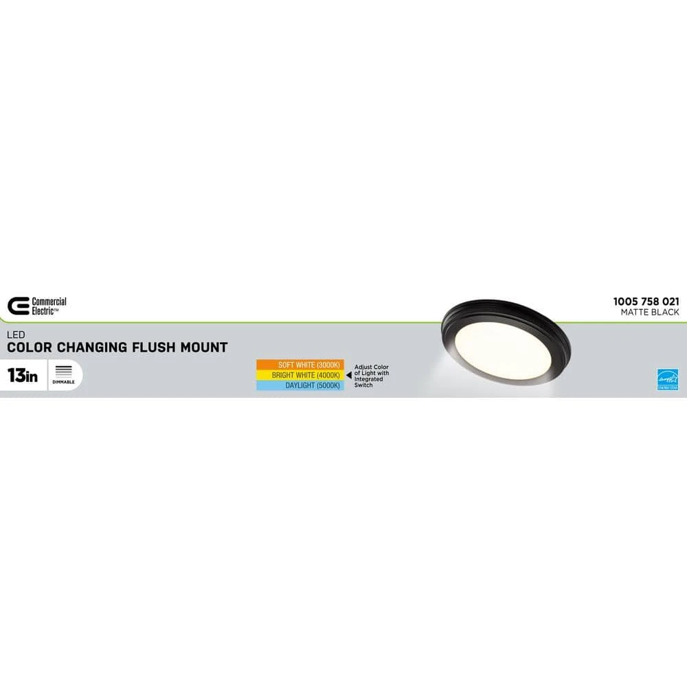 The edge lit technology of this 13 in. 19.98-Watt Matte Black Ceiling Flushmount has a 90 CRI high col or rendering that creates a perfect illumination and makes this fixture completely glare free providing more natural light for your home or office. The long-lasting LED technology provides light output equivalent to 180-Watt of traditional incandescent lighting, while using less than 20% of the energy for year round savings. If features a selectable col or temperature feature which allows you to choose your preferred white light color: warm 3000K, cool 4000K or daylight 5000K. Enjoy a 5-year warranty and a rated life of 45-years or 50,000-hours of continuous use. The ENERGY STAR certified light source is maintenance free with no bulbs to change. You will enjoy a light with a sleek, low profile and soft industrial design and it’s even easy to install with a provided bracket and only requires 1-person to install.