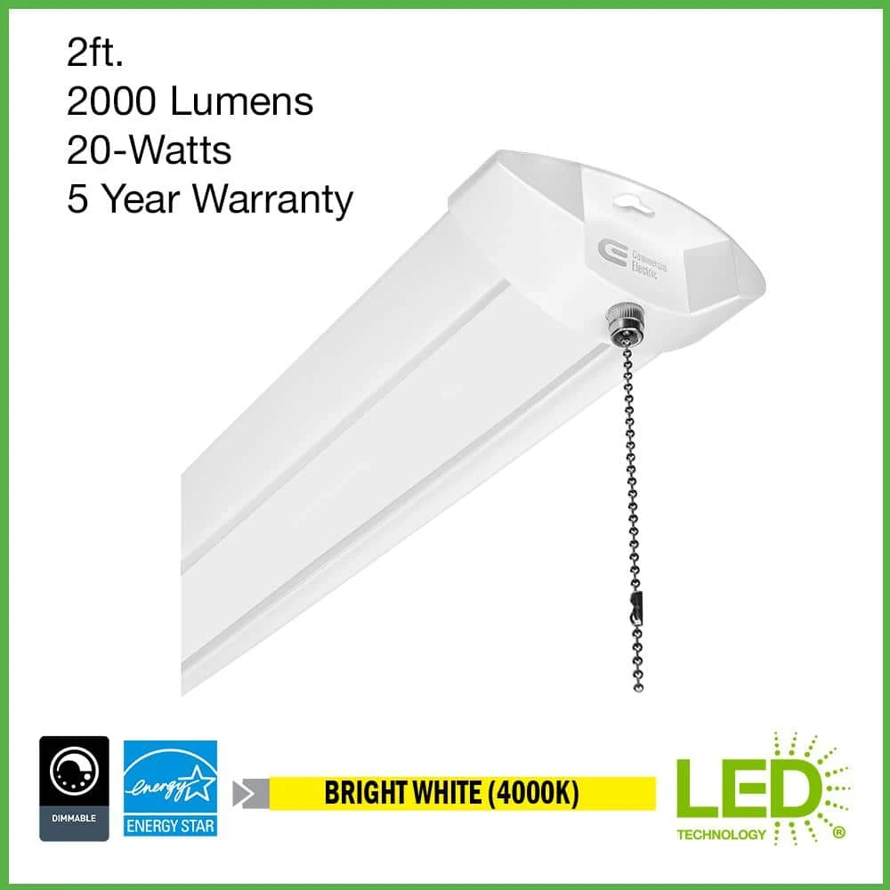 Commercial Electric 2 ft. LED Strip Light with Pull Chain is designed to replace any outdated fluorescent light with a crystal clear and energy-efficient integrated LED fixture. Ease This reduces energy consumption by as much as 79% compared to conventional lighting units and replaces 100-Watt bulb. Use the 20 in. on/off pull chain for easy activation. This fixture is maintenance free with no bulbs to replace for up to 50,000-hours. Ideal for closet, utility room, laundry room, stairway, hallway, basement, storage room, work bench or garage.