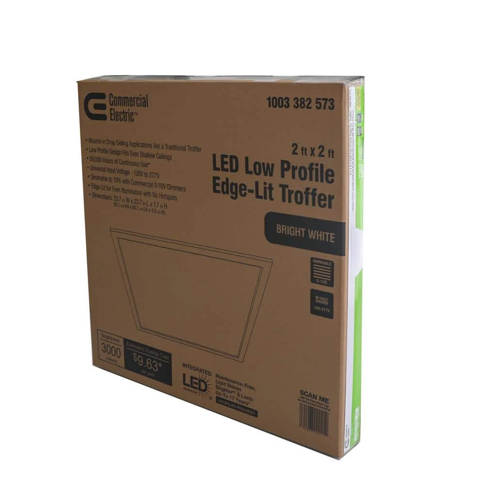 The Commercial Electric Integrated LED 2 ft. x 2 ft. LED Edge-Lit flat panel produces a gentle and uniform illumination, offering state of the art energy efficient lighting. The low profile flat panel is constructed from high quality aluminum and superior materials offering an enduring performance against light degradation. The LED flat panel design is easy to install making replacement of traditional fixtures simple.