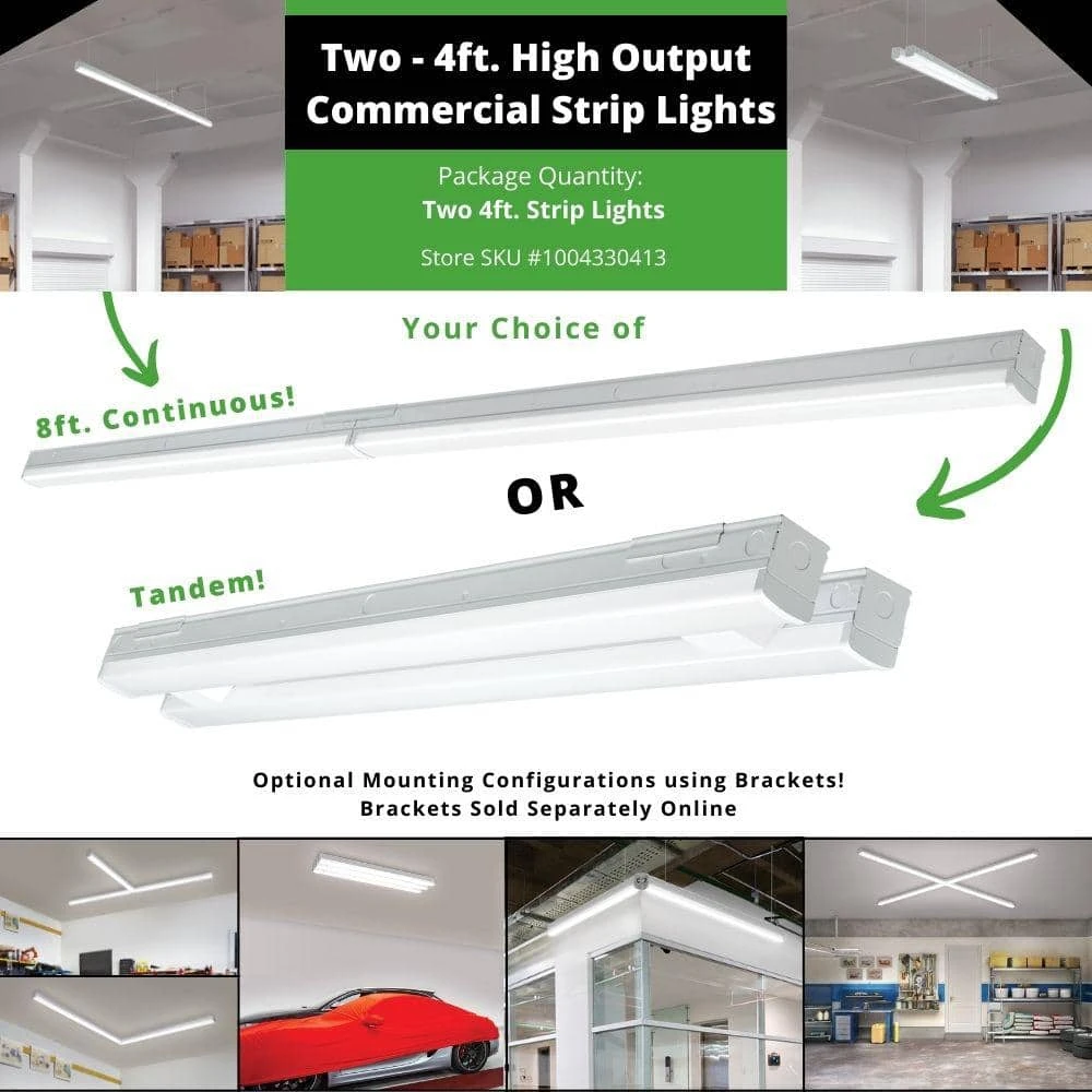 Commercial Electric’s 4 ft. High Output Linkable Integrated LED Strip Light replaces outdated fluorescent lights with cool energy-efficient LEDs. It emits powerful 5500 Lumens of brightness with 4000K Bright White light output using 50-Watts of electricity and dimmable. This strip light easy to install with all the wiring connections located inside the body of the fixture. It is linkable up to 8 units and offers multiple lighting configurations to maximize your lighting needs. Use mounting brackets to create the optimal lighting for your workspace: “T”, “L”, “X”, Parallel or Adjustable brackets. (each sold separately). Suggested applications are garage, repair shop, store aisles, open concept office, warehouse aisles, showrooms or small loading docks and more.