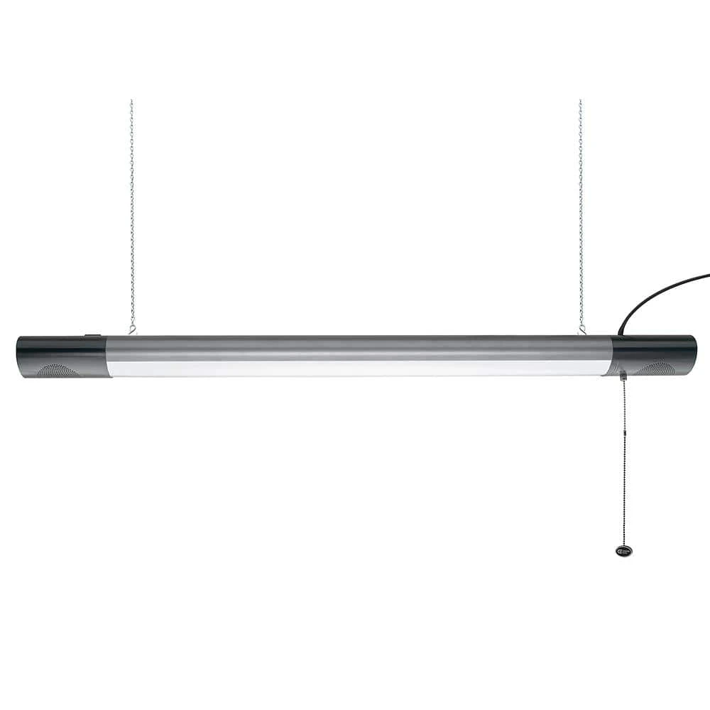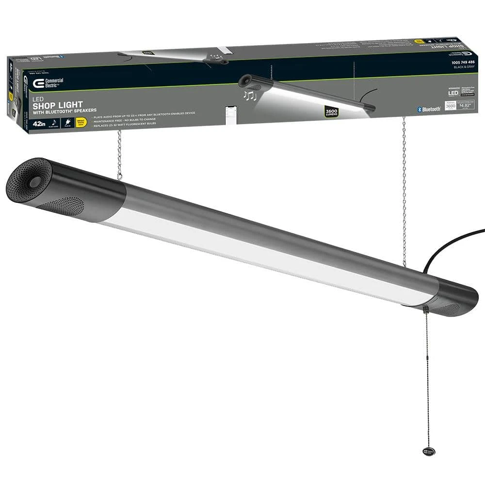 Commercial Electric 42in. Plug-in LED Shop Light with Bluetooth Speakers is designed to wirelessly connect to your smartphone to play your music or podcasts and still continues to provide crystal clear light output. You can activate audio from up to 33ft. and the speakers do not require any batteries or charging. Enable Bluetooth on your smart device using Commercial Electric’s app. To turn on just the light, there is a pull-chain for an easy grab. It is lightweight, easy to install and maintenance free with no bulbs to replace. Ideal for work shop, garage, basement, shed, small warehouse or entertainment room.