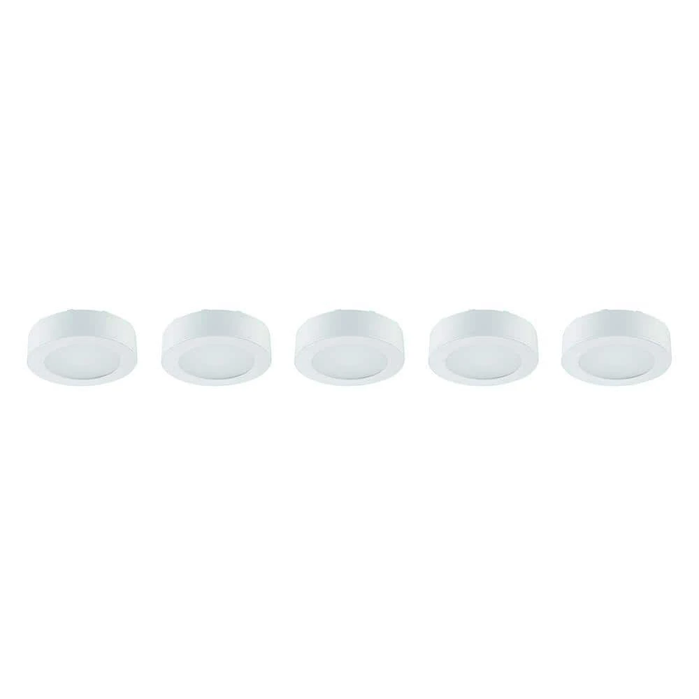 - Five 3.4-Watt LED puck lights with 2 ft. cable attached, 4 ft. adjustable power cord with on/off switch