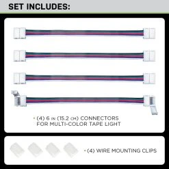 Customize multi-color plus white tape light installation. This set enables short jumps and turns in under cabinet and other LED strip light applications. Compatible with all CE color plus tape light. Connector set includes 4 x 6 in. snap connectors and 4 wire mounting clips. Perfect for under cabinet LED strip lights.