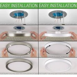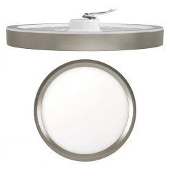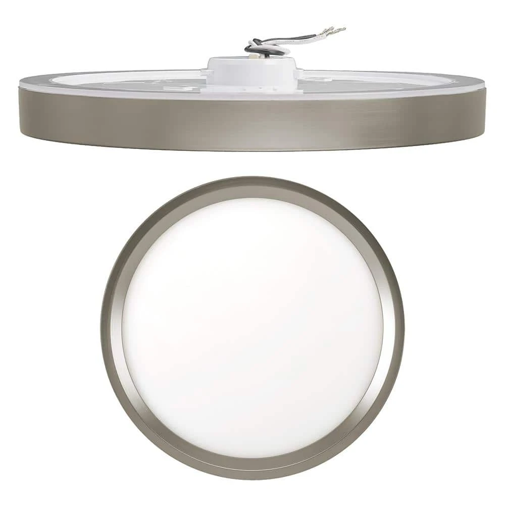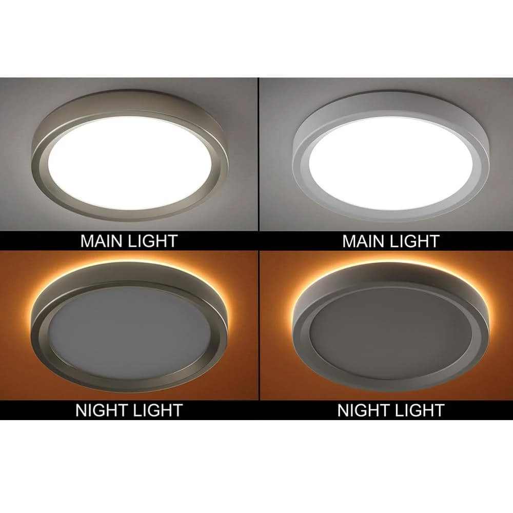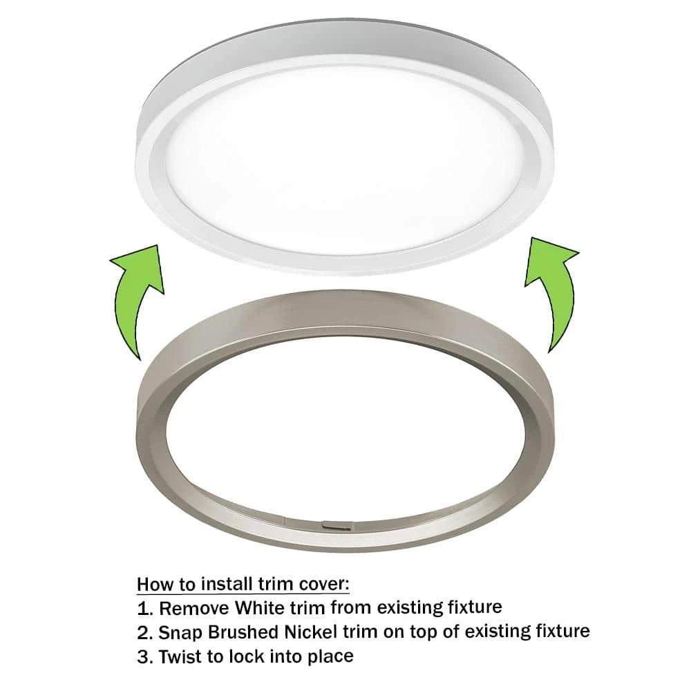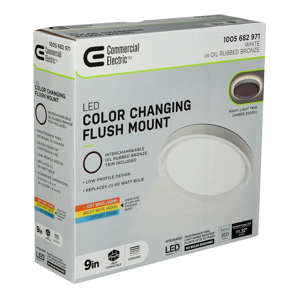 Commercial Electric Low Profile 9in. LED Flush Mount ceiling light with 2 interchangeable trims is the perfect way to update your lighting by replacing outdated incandescent bulbs with energy-efficient LED technology. Prior to installation, switch out the White trim for the Brushed Nickel trim to add a little pop of color into your space. Additionally, choose between 3 color temperatures of light output: Soft White, Bright White or Daylight using the slide switch on the back of the fixture. Activate the Night Light feature which emits a Soft Amber glow around the fixture providing warm ambient lighting. Our innovative mounting system allows for quick installation into existing junction boxes using the TwistFit mounting bracket. (included) This flush mount is maintenance free with no bulbs required and lasts up to 50,000 hours. Great for kitchen, pantry, bedrooms, bathrooms, closets, stairways, hallways, basement, laundry room, craft room, playroom, den/office, retail store or boutique.