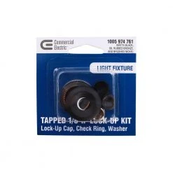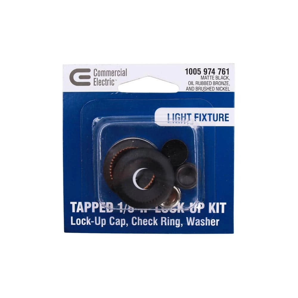 Secure bent glass shades onto ceiling fixtures with the Assorted Finish Lamp Lock-Up Kit with Cap Nuts. The Assorted Finishes easily match most hardware and lighting fixtures. This kit includes a washer, a check ring and a lock-up cap to complement existing lighting hardware. The hardware is tapped 1/8-IP and the lock-up cap can be hand tightened for easy installation.