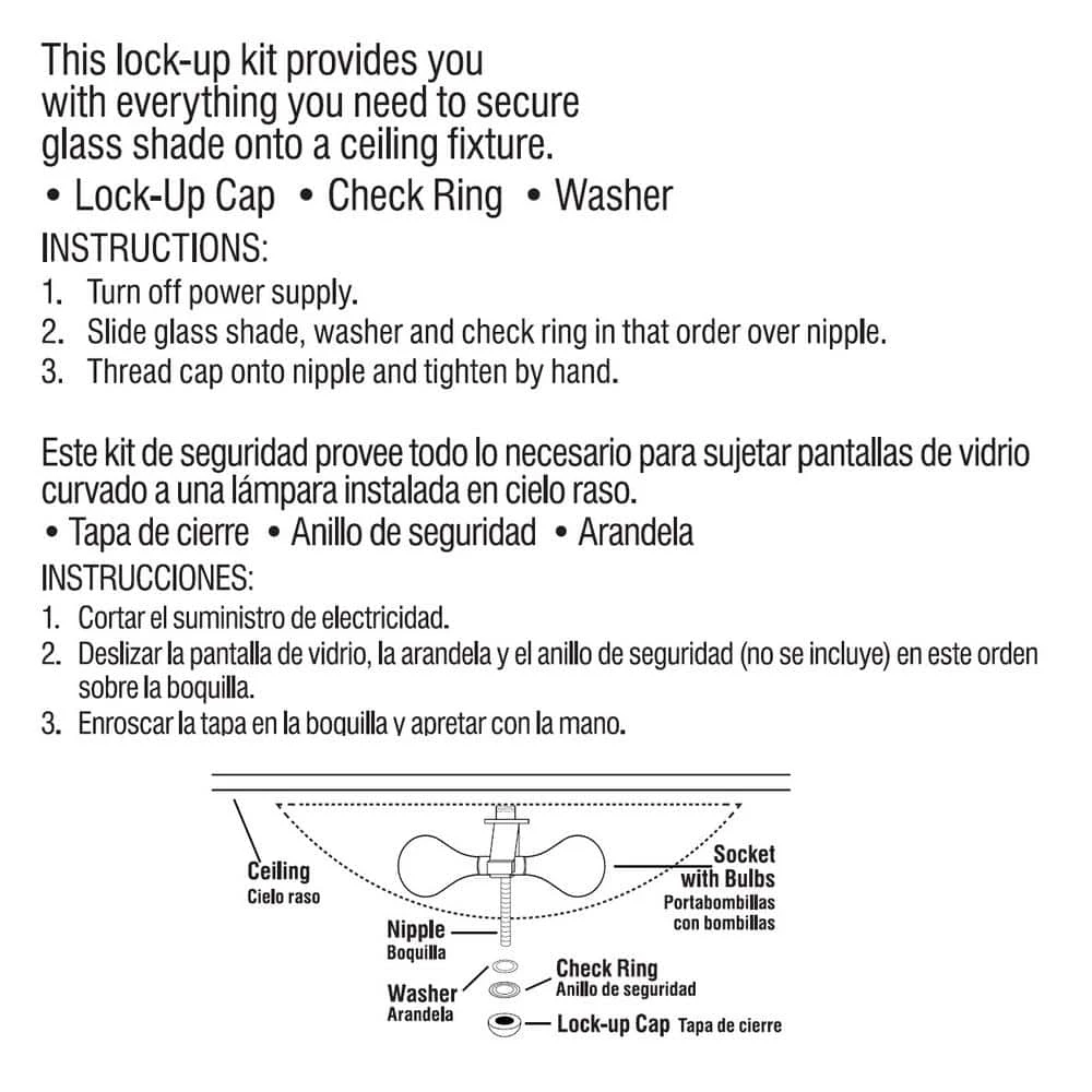 Secure bent glass shades onto ceiling fixtures with the Brass Finish Lock-Up Kit. The brass finish easily matches most hardware and lighting fixtures. This kit includes a washer, a check ring and a lock-up cap to complement existing lighting hardware. The hardware is tapped 1/8-IP and the lock-up cap can be hand tightened for easy installation.