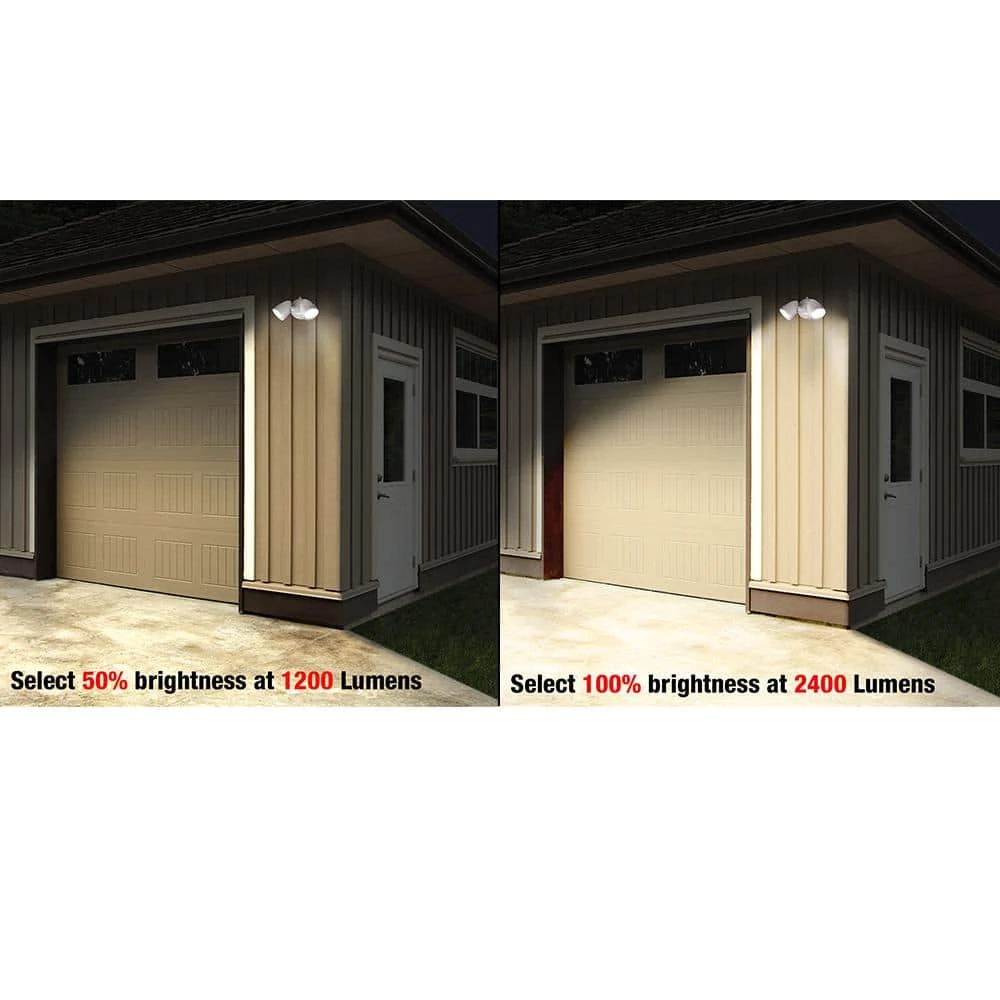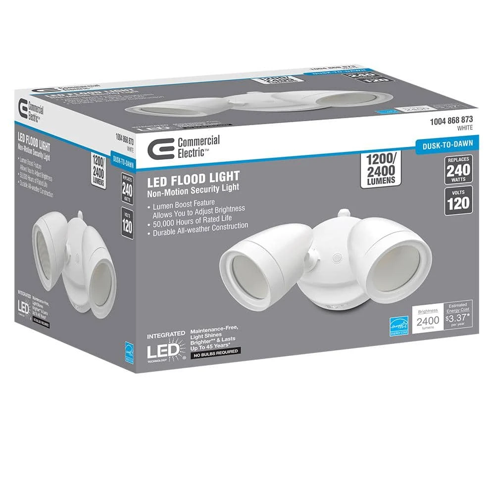 Commercial Electric Dusk to Dawn Lumen Boost White Twin Head LED Security Flood Light is the perfect solution for your outdoor lighting needs. Choose Dusk to Dawn feature for lights to automatically turn on at sunset and turn off at sunrise. Activate Lumen Boost feature which offers the choice of lighting intensity from main light at 1200 Lumens to high intensity at 2400 Lumens. Adjust the twin light heads to desired beam angle using your hands. This is made of durable all-weather construction; perfect for sub-zero weather all the way down to -40°! No more worries about climbing a ladder or hiring an electrician to change light bulbs, this is maintenance free with no bulbs to replace. Our LED security flood light ensures an abundance of safety and awareness, prevents possible injuries and increases property value.