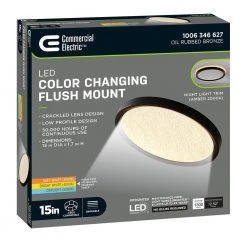 Commercial Electric’s 15 in. Low Profile Color Selectable LED Flush Mount with Night Light feature, acrylic crackle lens design in Oil Rubbed Bronze finish is the perfect way to add a bit of Modern flair to your home or office. It replaces outdated incandescent bulbs into a crystal clear energy-efficient integrated LED fixture. Prior to installation, choose between 3 color temperatures of light output: Soft White, Bright White or Daylight. Use the Night Light feature for added ambiance illuminating a warm soft Amber hue around the lens. It is lightweight, easy to install and maintenance free with no bulbs required. Ideal for kitchen, bedroom, bathroom, basement, office, stairwell, hallway/corridors, retail/boutiques and much more.