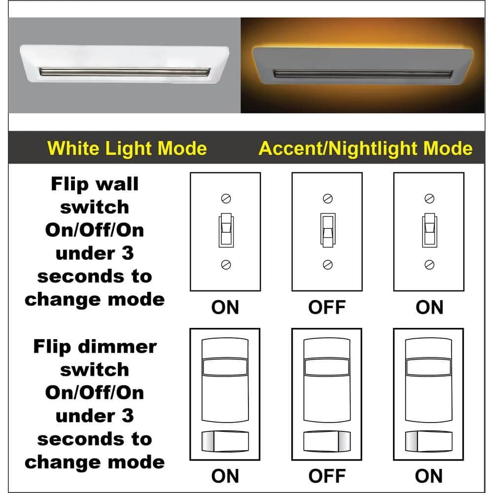 - Activate night light mode by toggling with wall switch: On/Off/On