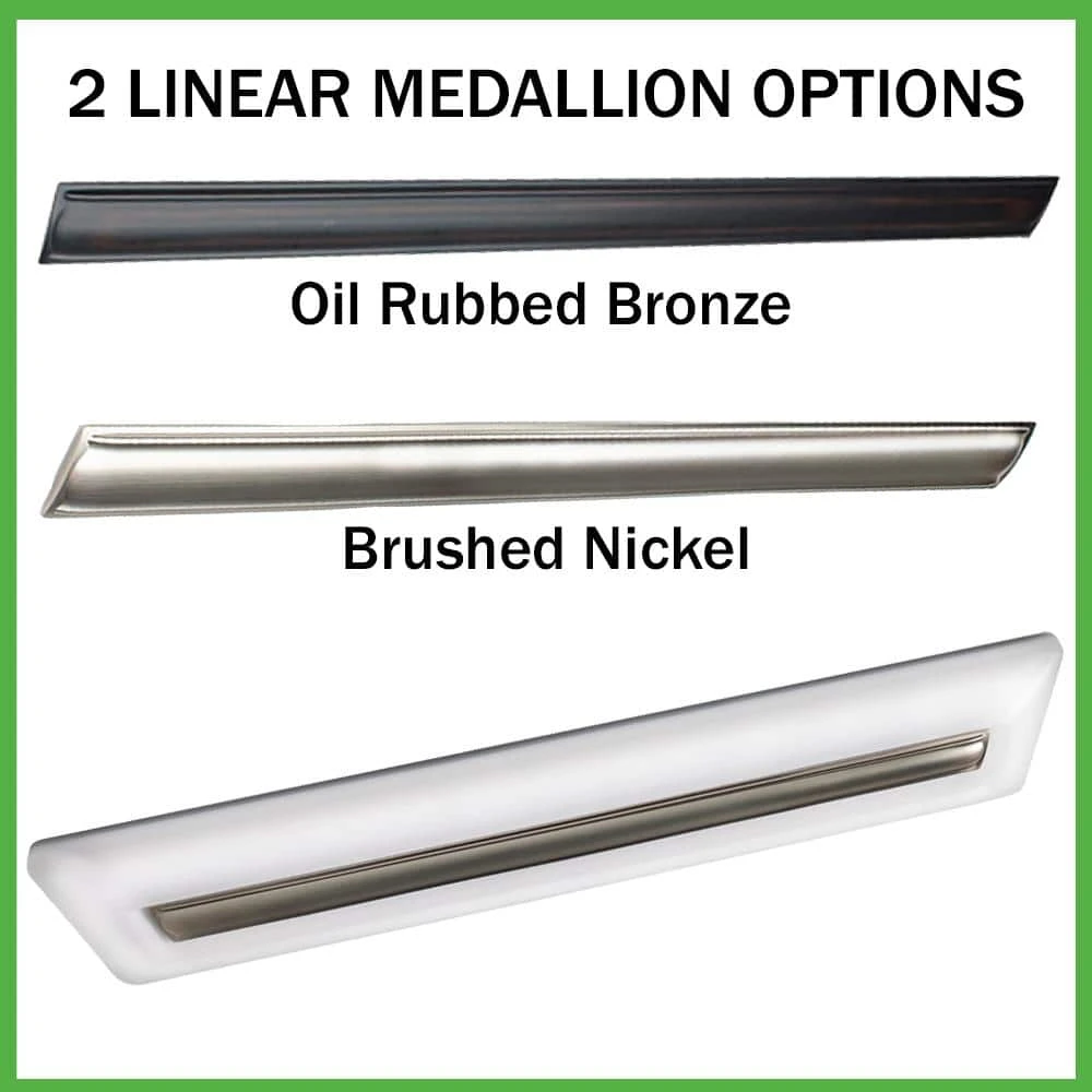 - Low profile White ceiling light with 2 decorative linear medallion options in Brushed Nickel and Oil Rubbed Bronze