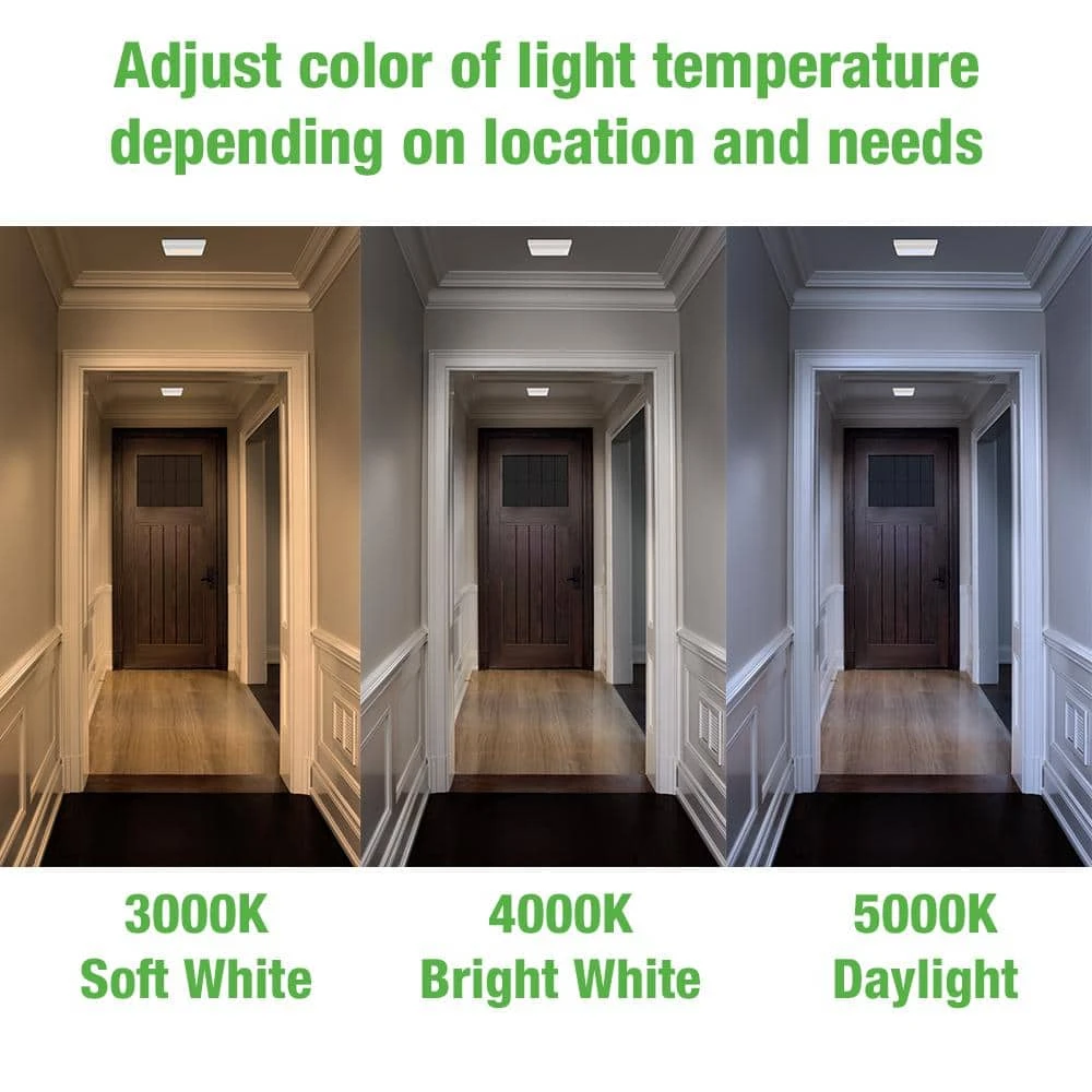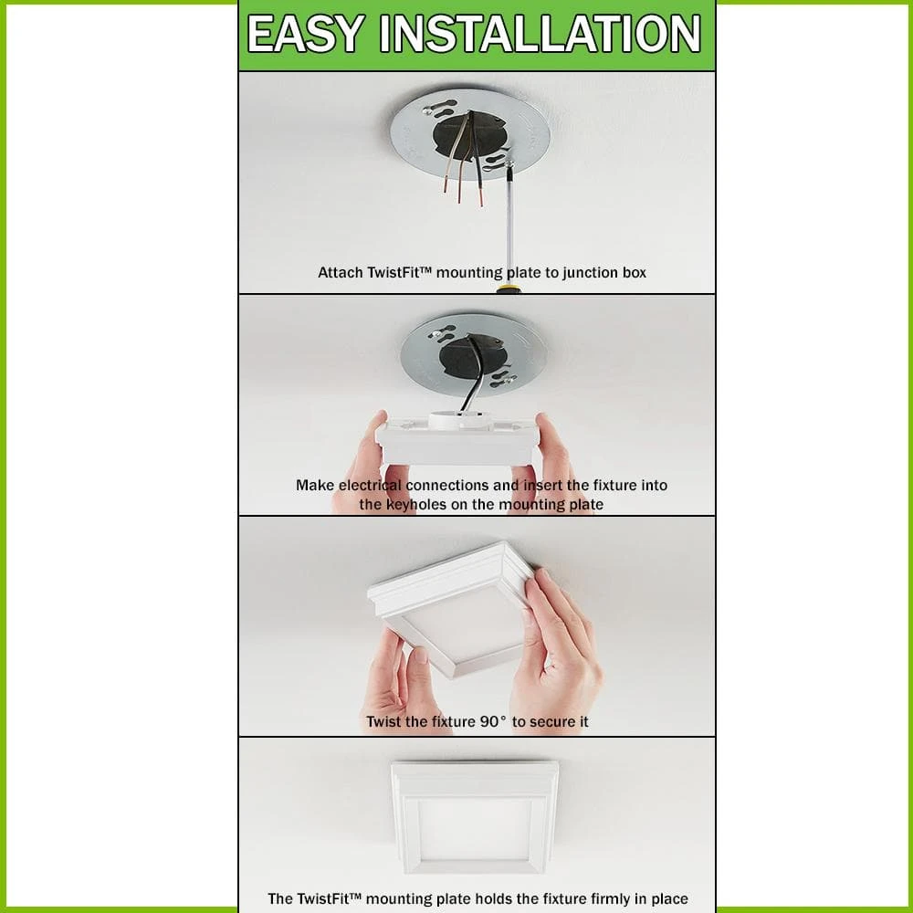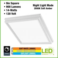 Commercial Electric 9in. LED Square Flush Mount with Night Light feature is the perfect combination of Contemporary design and innovative LED technology. Turn on the Night Light feature which glows a Soft Amber color around the fixture providing warm ambient lighting. Prior to installation, choose between 3 color temperatures of light output: Soft White, Bright White or Daylight depending on your location. Installation is a breeze using the TwistFit to Junction box mounting; just twist and lock firmly into place. Perfect for the DIY-er! This LED flush mount provides crystal-clear illumination and superior light engine for maintenance free service with absolutely no bulbs to replace. Great for bedrooms, bathrooms, living room, entry way, hallway, kitchen, basement, sun room, office, retail shops or lobby.