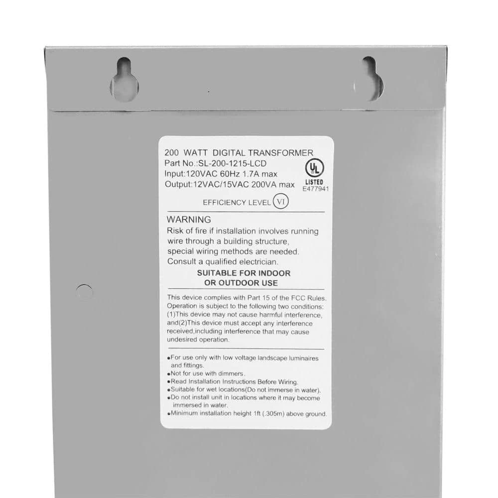 Our new Commercial Electric 200-Watt low profile professional grade landscape lighting transformer is made from 304 grade corrosion resistant stainless steel. At 200-Watt it can be used to power all kinds of landscape lighting projects, Ranging from smaller porch or deck lighting that use a single type of light fixture to larger lighting projects which require a combination of landscape fixtures such as deck lighting and spot lighting and path lighting working together in unison. Our new easy to use interface allows any one to program it from the novice to the professional landscaper at a touch of a button. Our new CE brand transformers are designed and built using a fully encased and potted toroidal transformer providing the most efficient and durable solution possible while eliminating annoying buzzing noise. Utilizing state of the art sensing circuits our transformers provide dual safety functions that detect and react to a system overloaded or a short circuit condition in a landscape installation. The transformer includes a photocell and digital timer control interface. The units are equipped with dual voltage output terminals (12-Volt and 15-Volt) which help compensate for voltage drops in high-wattage/longer wire runs as well as to help reduce cable loss when using 15-Volt LED fixtures.