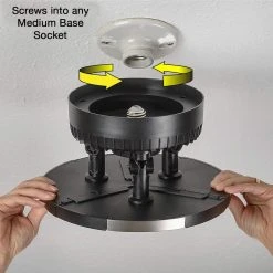 Commercial Electric 10in. Spin Light Integrated LED fixture with 3 Adjustable Light Heads is designed to screw into most existing plastic and porcelain medium base socket lamp holders without any wiring required; just like a light bulb! (optional junction box compatible). Simply screw the threaded base on the fixture body clockwise into the keyless lamp holder. Adjust the 3 light heads to direct the beam angle where desired from 0° to 60°. This fixture replaces (3) outdated 75W incandescent bulbs with crystal clear energy-efficient LED technology. It is has a lifespan up to 50,000 hours and is maintenance free with no bulbs required. Suggested applications are closet, bathroom, bedroom, laundry room, basement, garage, attic, stairway and more.