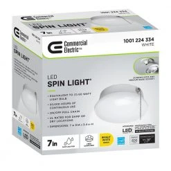 Commercial Electric’s 7 in. Pull Chain Spin Light Integrated LED Flush Mount Ceiling Light converts incandescent lights to energy-efficient LED fixture. This Spin Light is designed to simply screw into most existing plastic and porcelain lamp holders without any wiring required. Converts your lamp holder to a fixture in no time at all. *Direct wire option is available using bracket included in box. For quick activation, use the pull chain for an easy grab; add a decorative finial at the end to grasp as well. This fixture emits 830 Lumens of brightness using only 11-Watt of energy saving electricity, the environment and your wallet. Great for closets, bathrooms, stairways, basement, garage, attic or laundry room.