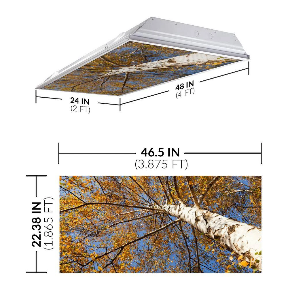 • 【UNIVERSAL 2×4 FIT】 Octo Lights’ decorative tree light covers seamlessly fit any standard 2×4 fluorescent ceiling light. The actual size of each panel measures, 22.38″ x 46.5″