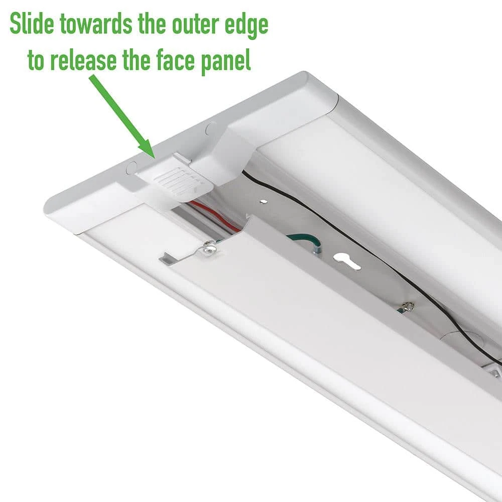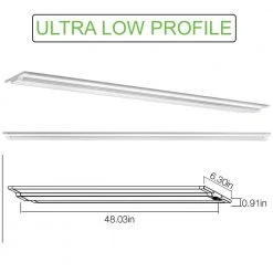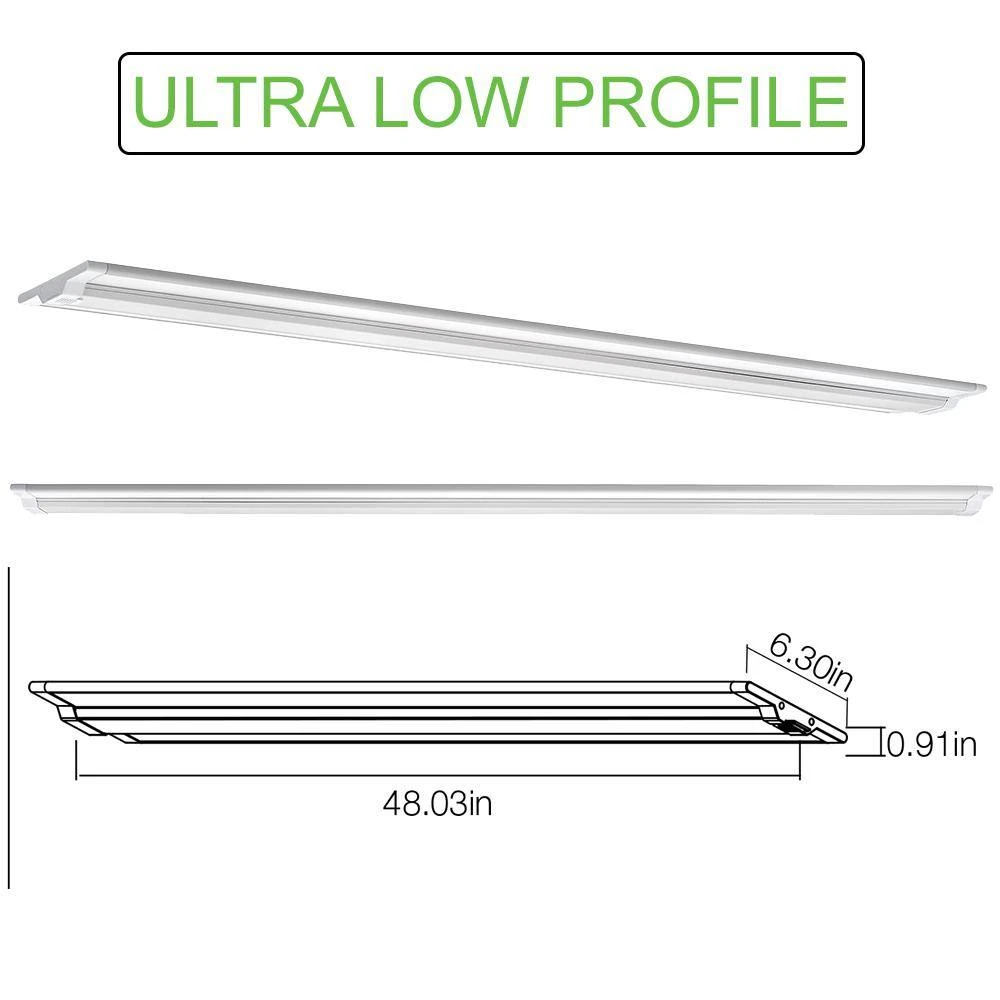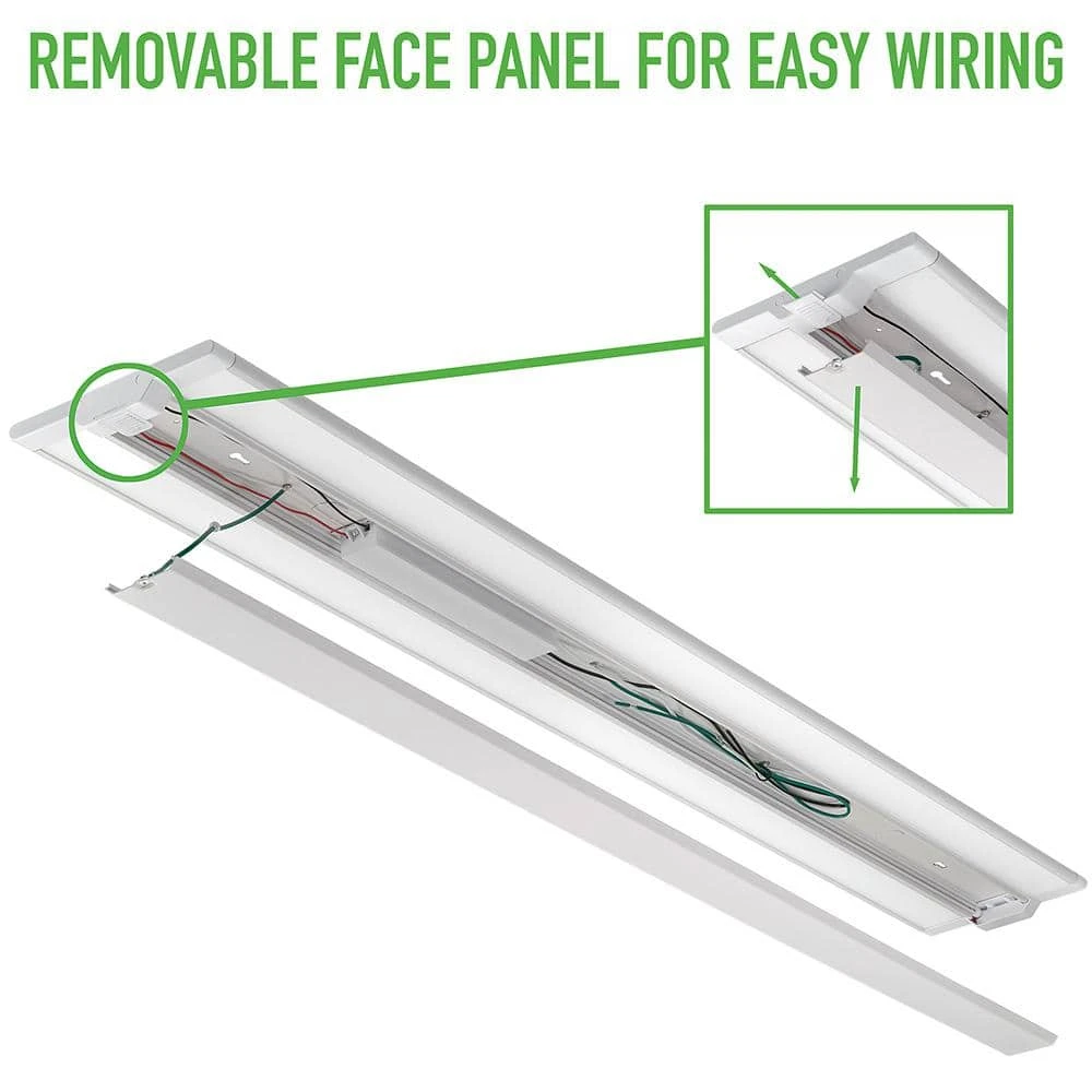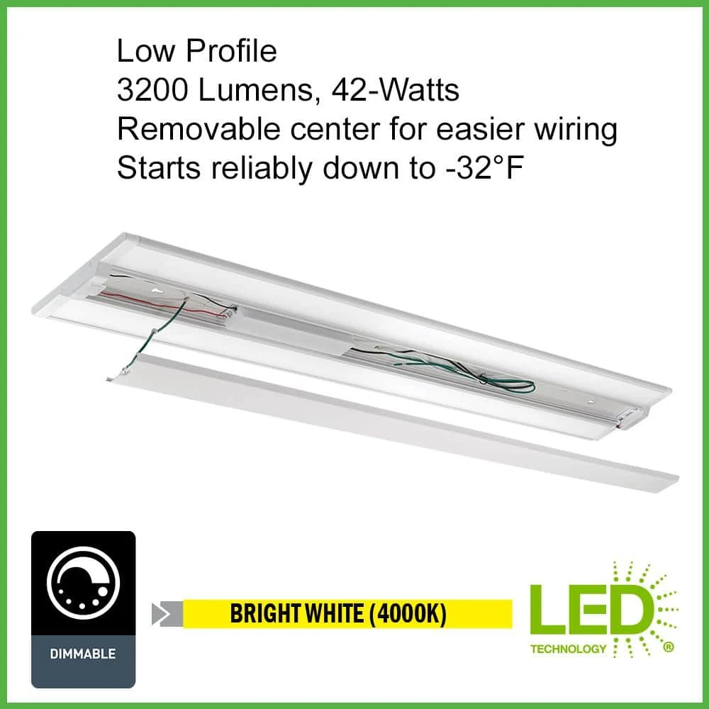Commercial Electric’s Ultra Low Profile 4 ft. Integrated LED Wrap Light an innovative, sleek and Contemporary fixture designed for spaces with low ceiling to floor clearance eliminating the bulky aesthetics with conventional fixtures. Installation is effortless due to the center face panel is removable for easy wiring. It emits crystal clear 3200 Lumens of brightness using only 42-Watts of electricity. Color temperature of light output is 4000K Bright White and dimmable. This wrap light provides cool emissions with energy-efficient LED technology and is maintenance free with no bulbs to replace. Ideal applications such as kitchen, bathrooms, large closets, stairways, hallways, laundry room, basement, garage, workshop or craft room.