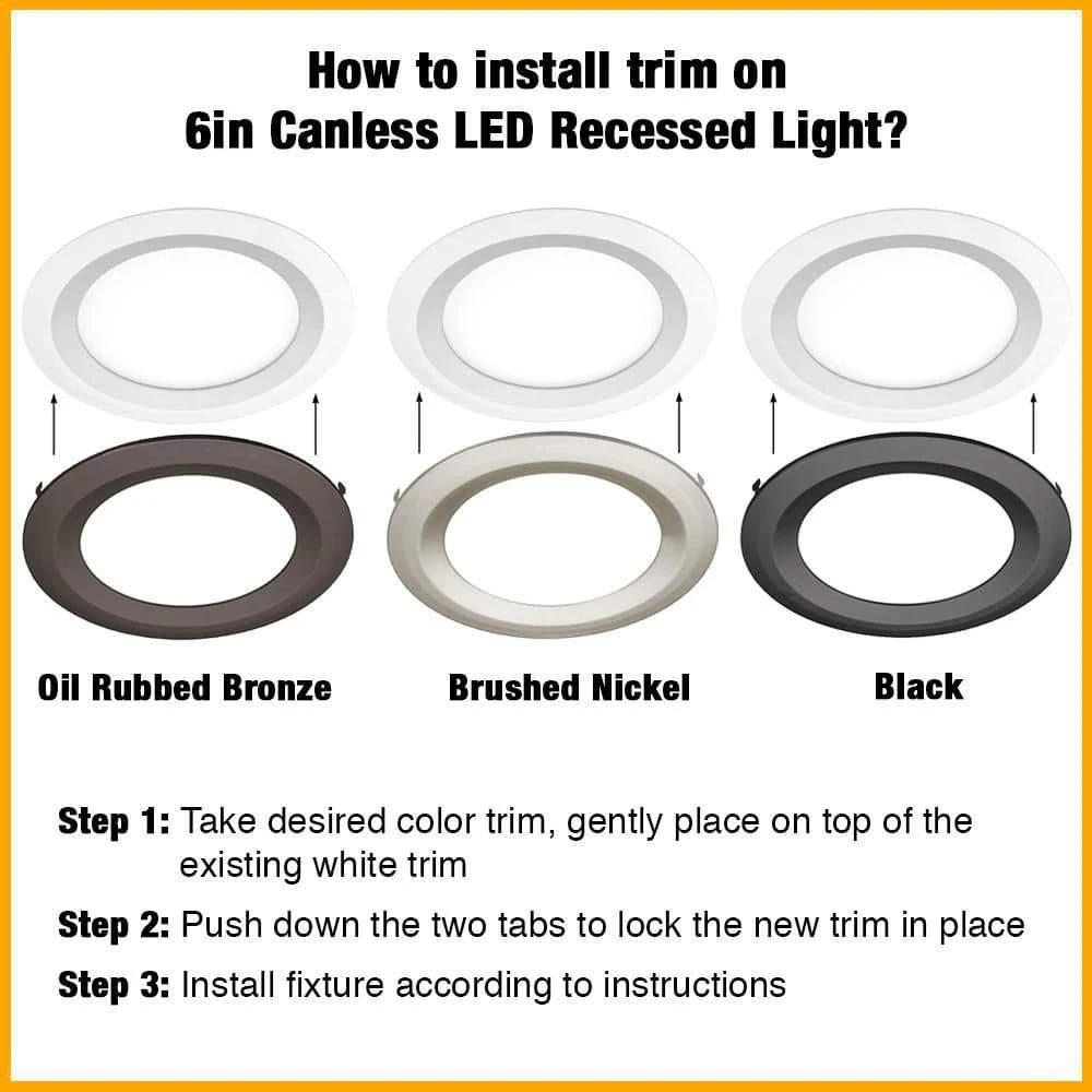 Commercial Electric Ultra Slim Canless LED Recessed Light Kit includes (24) 6in. fixtures and (24) Black Trims. Upgrade your incandescent light with a crystal-clear, energy-efficient LED fixture. Ideal for new construction, retrofit mounting and wet rated, which offers many possibilities for lighting layout planning. The canless, ultra-slim design is particularly convenient for low clearance or sloped ceilings, no can or joist required. Prior to installation, choose 5-color temperatures of light output between Warm White to Daylight and add the Black trim as a finishing touch to your lighting design. With crystal-clear illumination, there is no yellowing, discoloration or dark spots over time. This LED light is long-lasting for maintenance free service with no bulbs required. Great for kitchen, family room, living room, entry way, hallway, bathroom/shower, bedroom, basement, office, retail shops, theatres, lobby/reception areas and so much more.