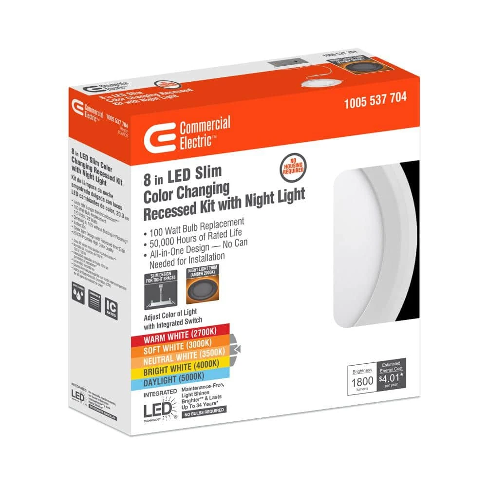 Commercial Electric Ultra Slim 8in. Canless LED Recessed Downlight with Night Light feature and multiple light output options is one of the most innovative and simplest ways to upgrade your existing recessed lights to energy-efficient LEDs. This innovative fixture offers three unique features than any light on the market. First, the canless, ultra slim design is the wave of the future; no need for cans or joist; easily installs into low clearance or sloped ceilings. Second, prior to installation, choose between (5) color temperatures of light output for your space; Warm White, Soft White, Cool White, Bright White or Daylight and you can change your mind anytime. And third, the Night Light feature glows a soft Amber hue around the trim ideal for end of evening activities, hallways, baby’s room or movie night. Suggested applications such as kitchen, family room, living room, entry way, hallway, bathroom/shower, bedroom, basement, office, retail shops, theatres, lobby/reception areas and so much more.